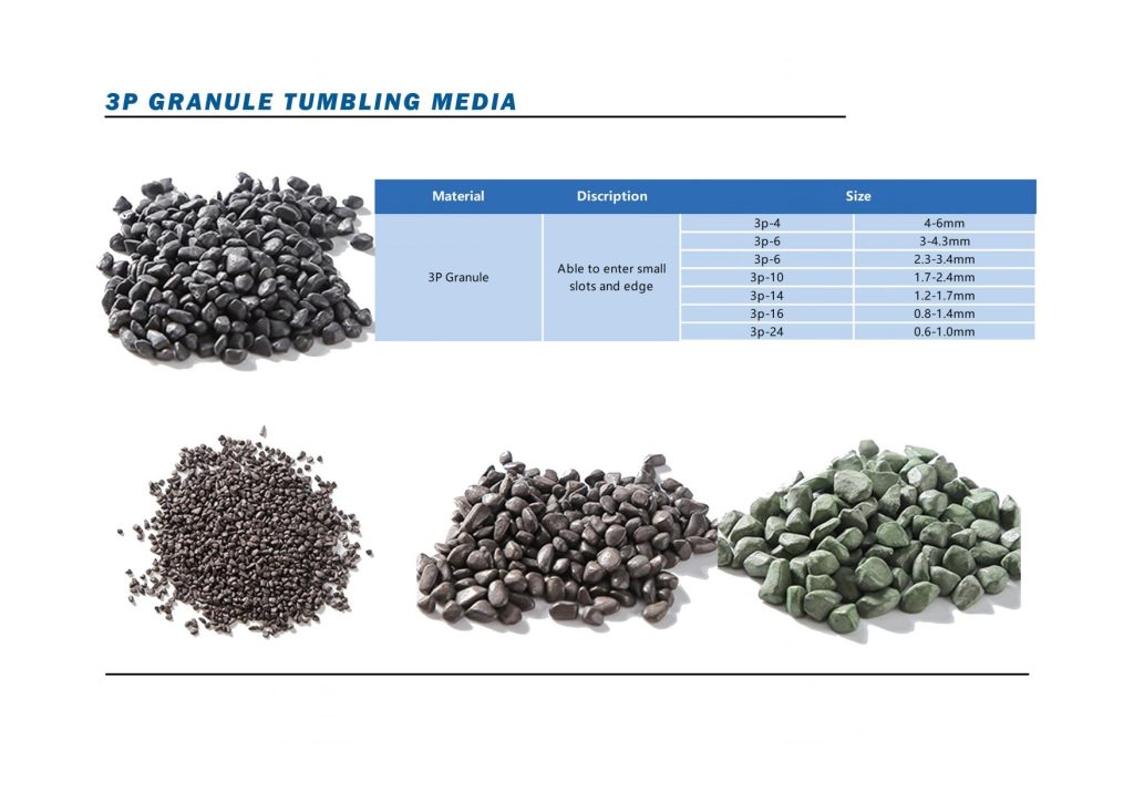 The 3P Granule Tumbling Media is an advanced random‑shape polishing media composed of a mix of abrasives, clay, feldspar, and sand, designed for high‑precision mass finishing. Its irregular granule form allows the media to penetrate tight holes and intricate contours, delivering fine edge‑finishing, micro‑cutting, and high‑luster results without significantly altering part dimensions.