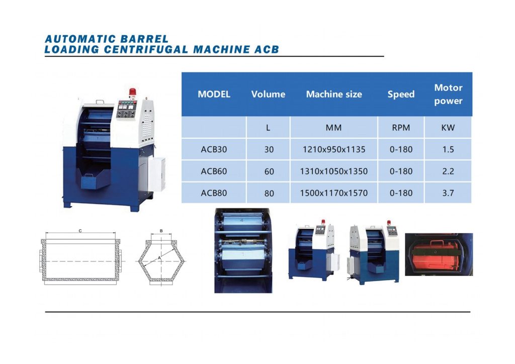The Automatic Barrel Loading Centrifugal Machine ACB is an advanced mass‑finishing system that automates the loading, tumbling, and discharge of parts and media, significantly reducing handling time and operator intervention. It uses high‑speed centrifugal action to intensify contact between the parts and abrasive media, delivering fast and uniform finishing of components. The machine features a multi‐barrel configuration, programmable timers, adjustable speeds, and an automatic unloading mechanism to streamline workflow. Built for productivity, it handles large batches of parts with minimal downtime and consistent results. Ideal for industries like automotive, aerospace, and precision manufacturing seeking high‐throughput surface finishing solutions.