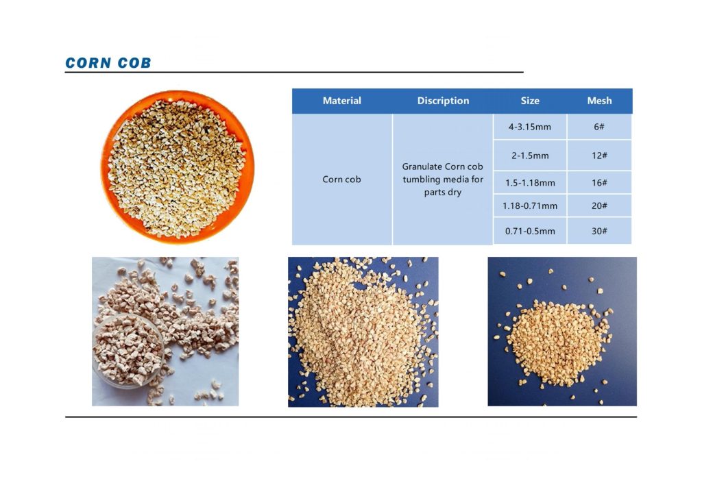 Corn Cob is a natural, biodegradable tumbling and polishing media made from ground and processed corn cobs, widely used in vibratory or barrel finishing machines. It is lightweight, soft, and absorbent, making it ideal for drying, polishing, and burnishing parts without scratching or altering the dimensions of delicate components. Corn cob media is often used with or without polishing compounds to achieve a smooth, satin, or glossy finish on metals, plastics, and even wood. Its natural texture also helps absorb residual moisture or oils from parts after wet finishing processes. Because it is reusable, cost-effective, and environmentally friendly, corn cob remains a popular choice for both finishing and drying applications in mass production.